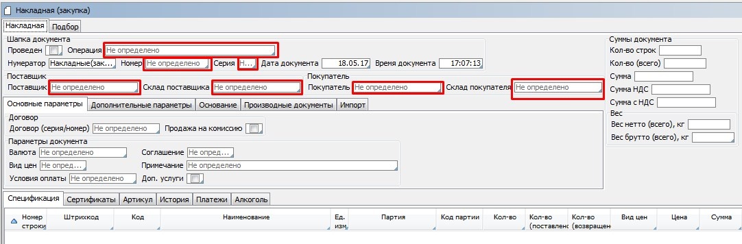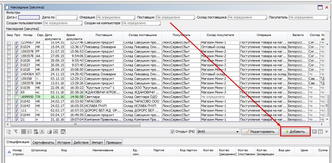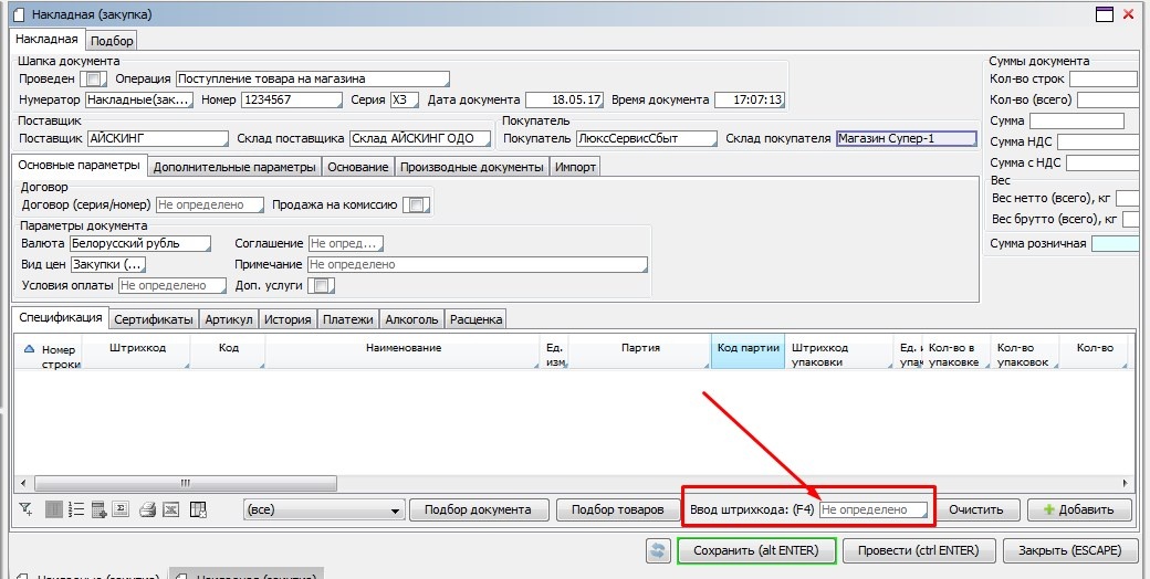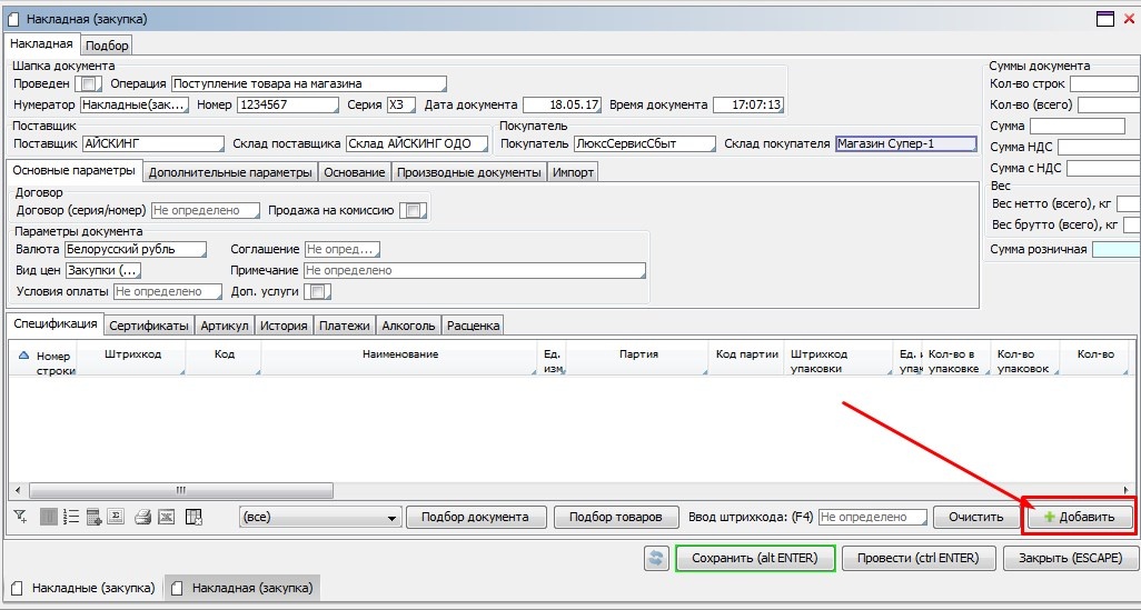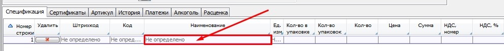 Для заполнения спецификации нам необходимо внести на форму перечень товаров поступающих на складмагазин.