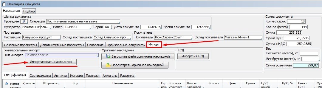 Нажимаем кнопку "Импортировать накладную" - выбираем файл импорта - нажимаем ОК.