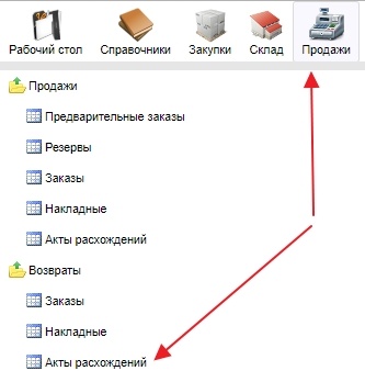 Акты расхождений при возврате от покупателя находятся в форме Продажи - Возвраты - Акты расхождений
