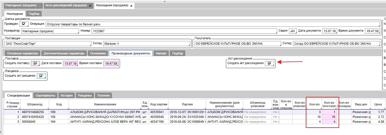 Акт расхождения формируется при соответствующей настройке(галочке)(во вкладке "Производные документы") и при отличии количества поставленного от количество заказанного в документе расходной накладной.
