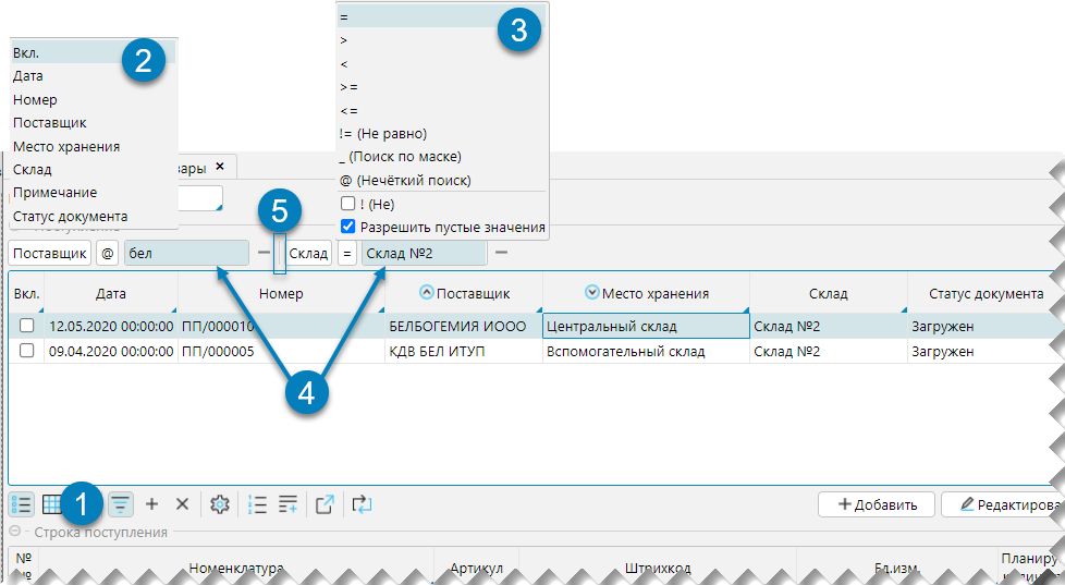 Механизм фильтрации вызывается кнопкой или функциональной клавишей F3 (рис. 8(1)). Вверху формы появляется конструктор запроса, в котором указывается колонка (рис. 8(2)), по значениям которой будет производиться отбор, оператор условия (рис. 8(3)), применяемого к значению, и значение для отбора(рис. 8(4)). Условия могут быть созданы как для числовых, так и для текстовых значений по любым колонкам, доступным на форме. Возможно применение неограниченного количества условий, объединенных логикой "И" или "ИЛИ" (рис. 8(5)).