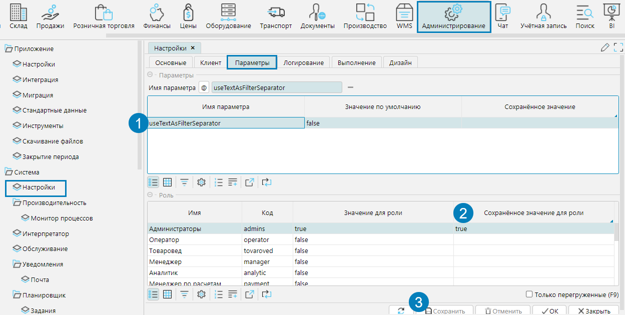 В системе есть возможность настроить отображение логики отбора текстом И/ИЛИ. Для этого в Администрирование-Система-Настройки-Параметры необходимо для роли установить значениеtrueдля параметраuseTextAsFiltrSeparator (рис. 9)