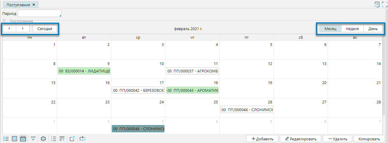 В этом представлении данные отображаются в календарной сетке. Кнопка переводит данные в режим календаря (рис. 13). Данные могут отображаться за месяц, неделю или день. Изменить дату объекта можно перетянув его в другую ячейку. Данные можно листать кнопками по месяцам/неделям/дням, в зависимости от выбранного варианта отображения. Кнопка Сегодня перемещает курсор на текущую дату.