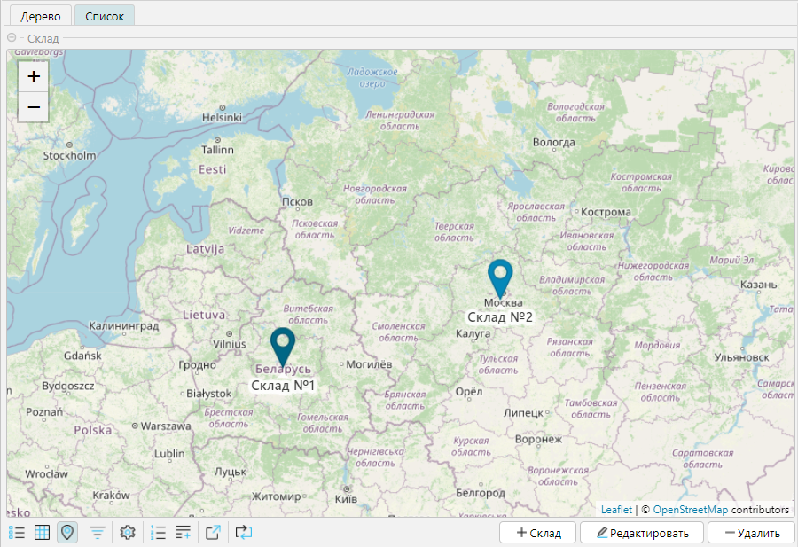 Карта позволяет отображать список объектов в виде точек на карте. В данном представлении можно редактировать данные (например, перетянуть точку), и они будут сохранены, как если бы изменения вводились вручную в табличном представлении. Данное представление доступно только на формах, где представлены объекты с координатами. Для переключения в режим карты, используют кнопку на панели инструментов.