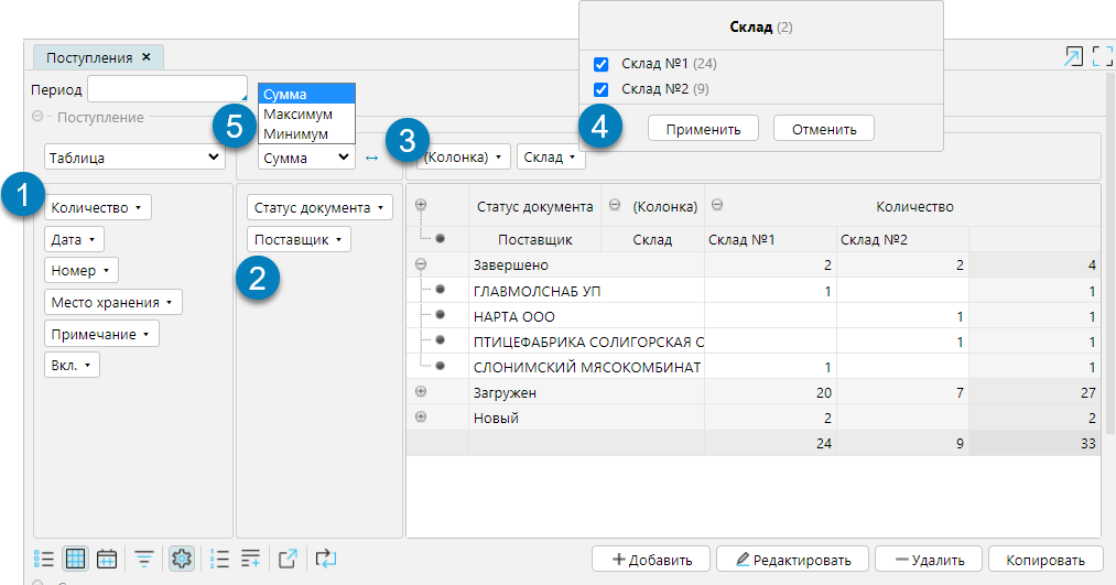 Кнопка на панели инструментов переводит табличное представление в режим сводной таблицы. Для создания отчета могут быть использованы все доступные на форме колонки (рис. 10(1)). Для группировки данных соответствующие колонки надо переместить методом drag-and-drop в область строк (рис. 10(2)). Колонки с числовыми значениями и подсчет количества записей предопределены в фильтре Колонка (рис. 10(3)), где пользователь отмечает необходимые ему данные. Если для анализа необходимо использовать значения других колонок, не указанных в фильтре, их надо переместить в область столбцов. По каждому столбцу можно выбрать значения, которые будут использоваться (рис. 10(4)). Числовые данные интерпретируются в разрезе суммы, максимального или минимального значения (рис. 10(5)). В представлении поддерживаются механизмы упорядочивания и фильтрации.