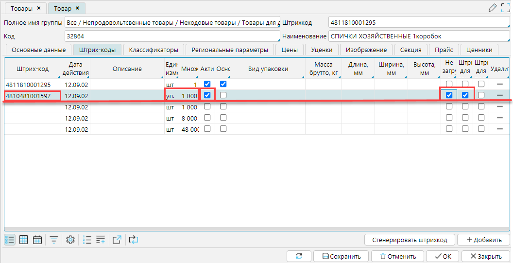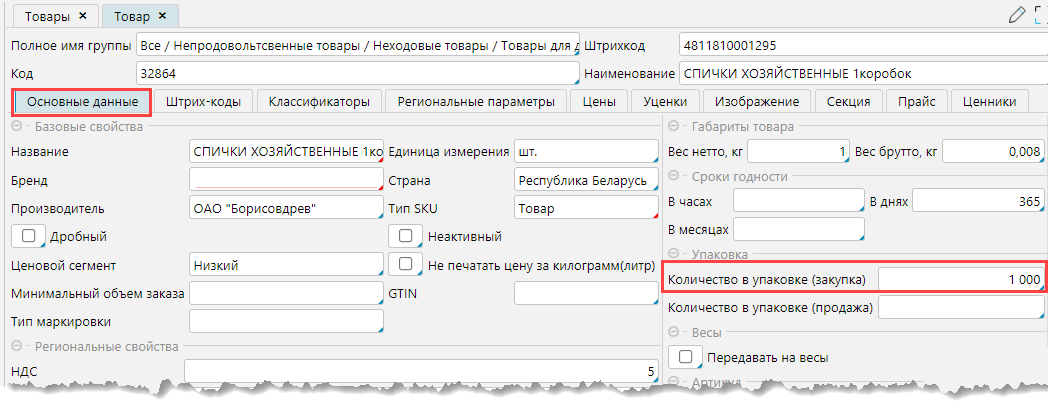 В карточке товара откроем вкладку штрих-коды и привяжем к нему штрихкод упаковки (рис. 1). Здесь указываем множитель - 1000, ставим галочку "Штрихкод для закупки" (что позволит отобразить количество единиц в упаковке, т.е. 1000, во вкладке Основные данные - рис. 2), а также делаем отметку признака "Не грузить в оборудование" для того, чтобы на кассах не отобразилась цена за короб.