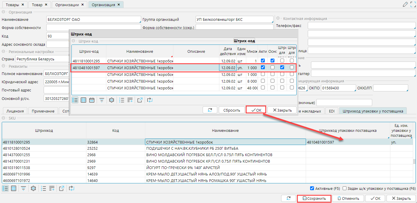 2. На форме Справочники – Организации откроем карточку поставщика рассматриваемого товара (БелХозТорг ОАО) и сделаем привязку штрихкода упаковки.