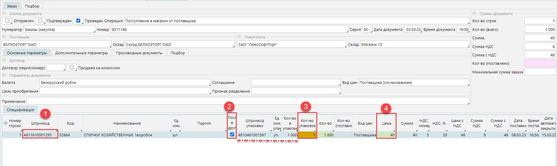 4. На форме Закупки – Заказы создадим новый заказ. В спецификации указываем штрихкод коробка́ (НЕ УПАКОВКИ), т.е. 4811810001295(рис. 5-1), штрихкод упаковки программа подтягивает автоматически.