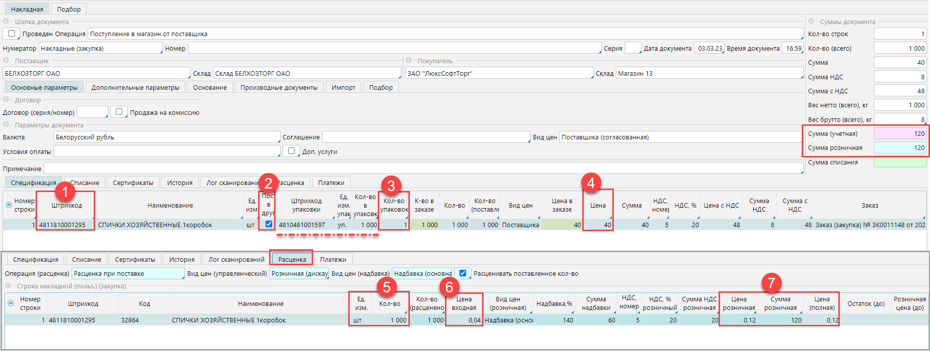 5. При создании накладной также указывается  штрихкод 4811810001295 (т.е. штрихкод коробка рис. 6-1), штрихкод упаковки подтягивается автоматически, отмечен признак "Поступление в других единицах" (рис. 6-2), указывается  количество упаковок (рис. 6-3) и подтягивается цена за упаковку (рис. 6-4), а общее количество просчитывается программой  (если накладная создается на основе заказа, эти данные подтянутся из него) (рис. 6).