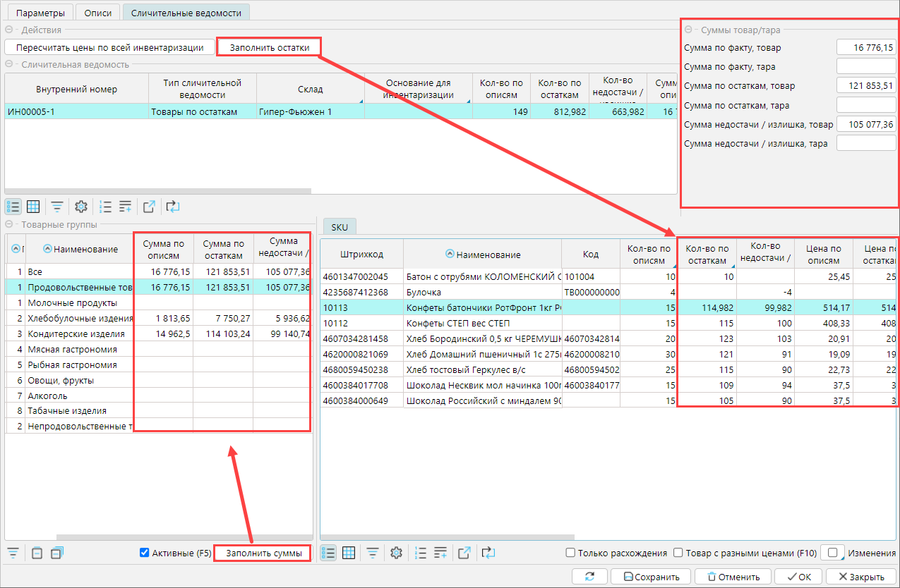 Если какие-либо данные по инвентаризации были изменены, чтобы они отразились в сличительной ведомости, необходимо снова использовать кнопку Заполнить остатки.