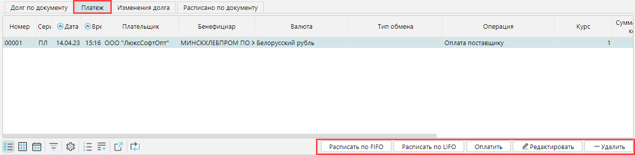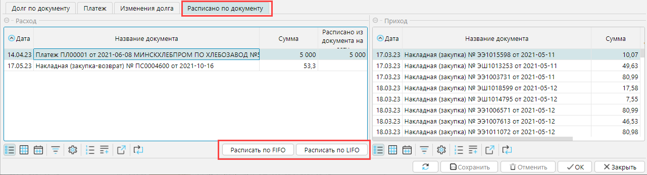 Расписать по FIFO/ LIFO - сумма выделенного платежа будет разнесена на доступные документы прихода по указанному методу (FIFO/ LIFO).