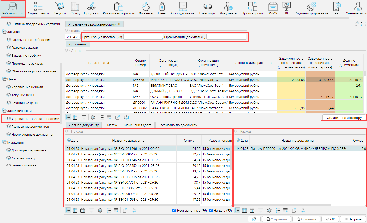 По каждому договору показана Задолженность на конец дня (управленческая) - с учетом условий оплаты по договору; и Задолженность на конец дня (бухгалтерская) - это задолженность без учета отсрочек оплаты по условиям договора. Долг по документам - это сумма задолженности, сформированная документами в системе, которые можно просмотреть на вкладке Долг по документу. В секции Приход отображаются документы, увеличивающие задолженность, в секции Расход - уменьшающие.