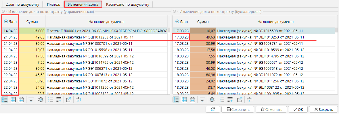На вкладке Изменения долга в соответствующих блоках отображаются документы, которые сформировали управленческую и бухгалтерскую задолженность.