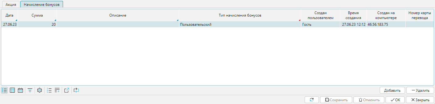 Чтобы начислить бонусы необходимо нажать кнопку Добавить и в появившейся строке указать количество бонусов, затем сохранить изменения.
