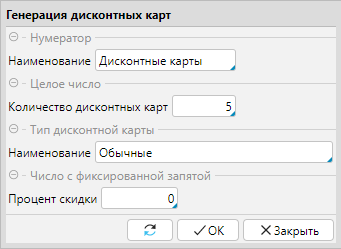 Сгенерировать дисконтные карты - позволяет создать в системе несколько новых дисконтных карт.  При нажатии на кнопку откроется окно, где: