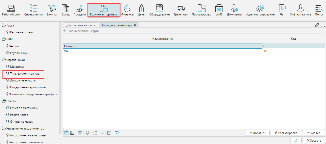 Добавить/Редактировать/Удалить - кнопки для соответствующих действий с дисконтной картой.