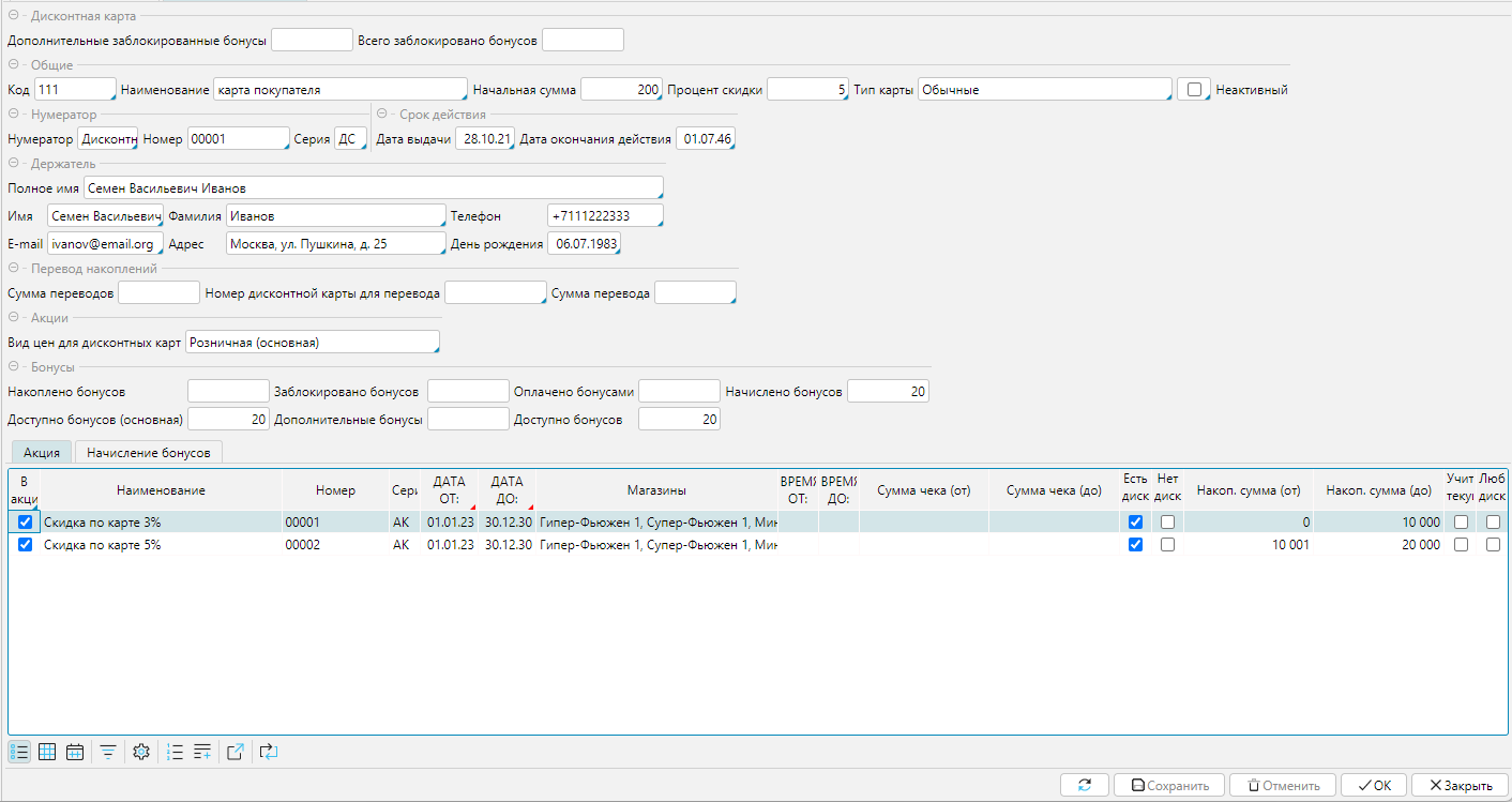 Дата выдачи/окончания действия - период действия дисконтной карты. Дата выдачи обязательно должна быть указана, по умолчанию дата выдачи заполняется датой создания карты.