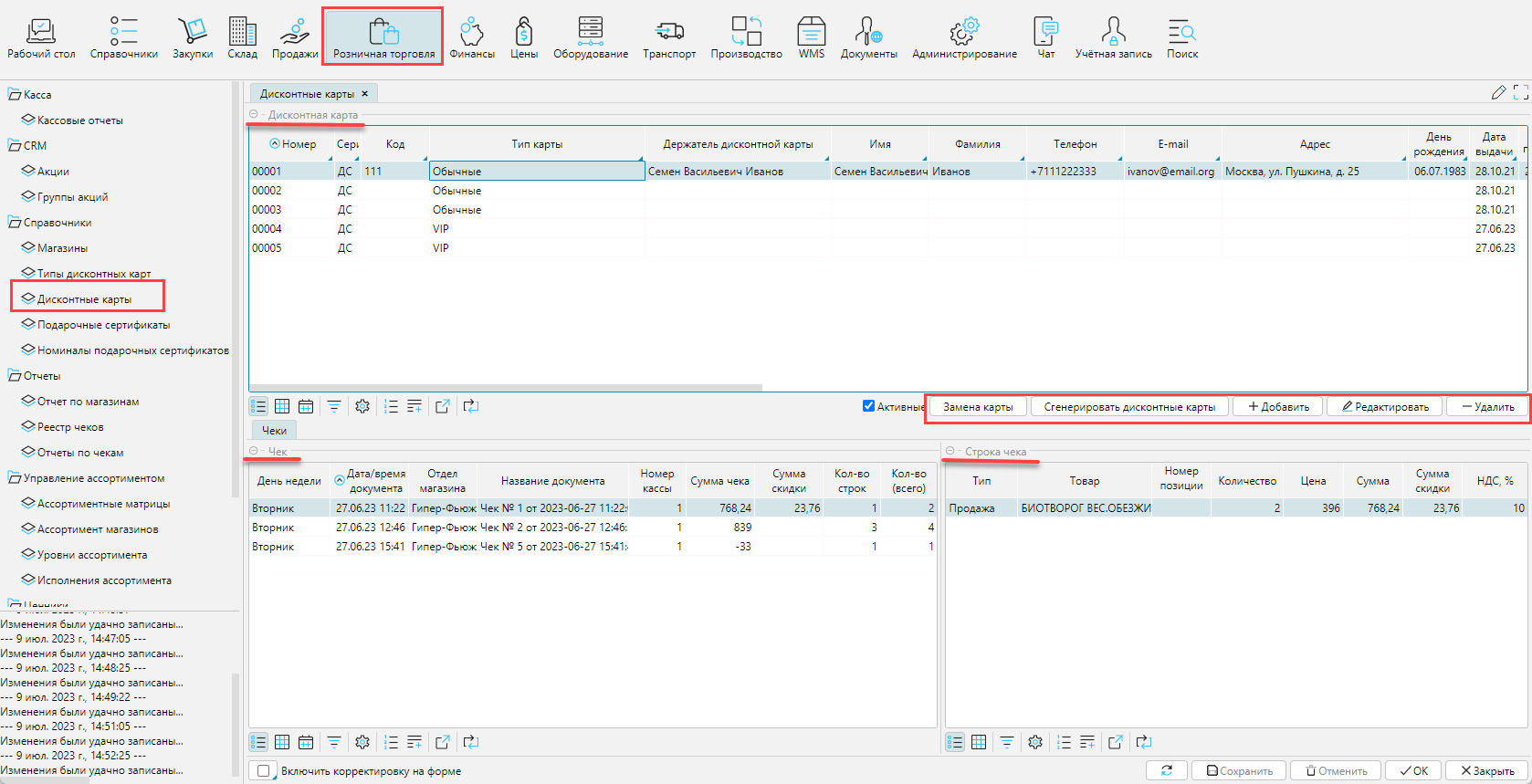 Все дисконтные карты в системе отображаются на форме Розничная торговля - Дисконтные карты (рис. 3). В верхней части формы отображается список дисконтных карт, а в нижней - по выделенной дисконтной  карте можно просмотреть чеки и товары чека, которые были приобретены с предъявлением карты.