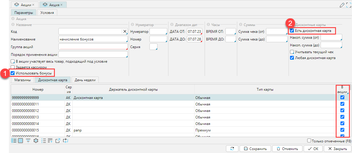 отмечают признак Есть дисконтная карта и отмечают карты, на которые возможно начисление бонусов