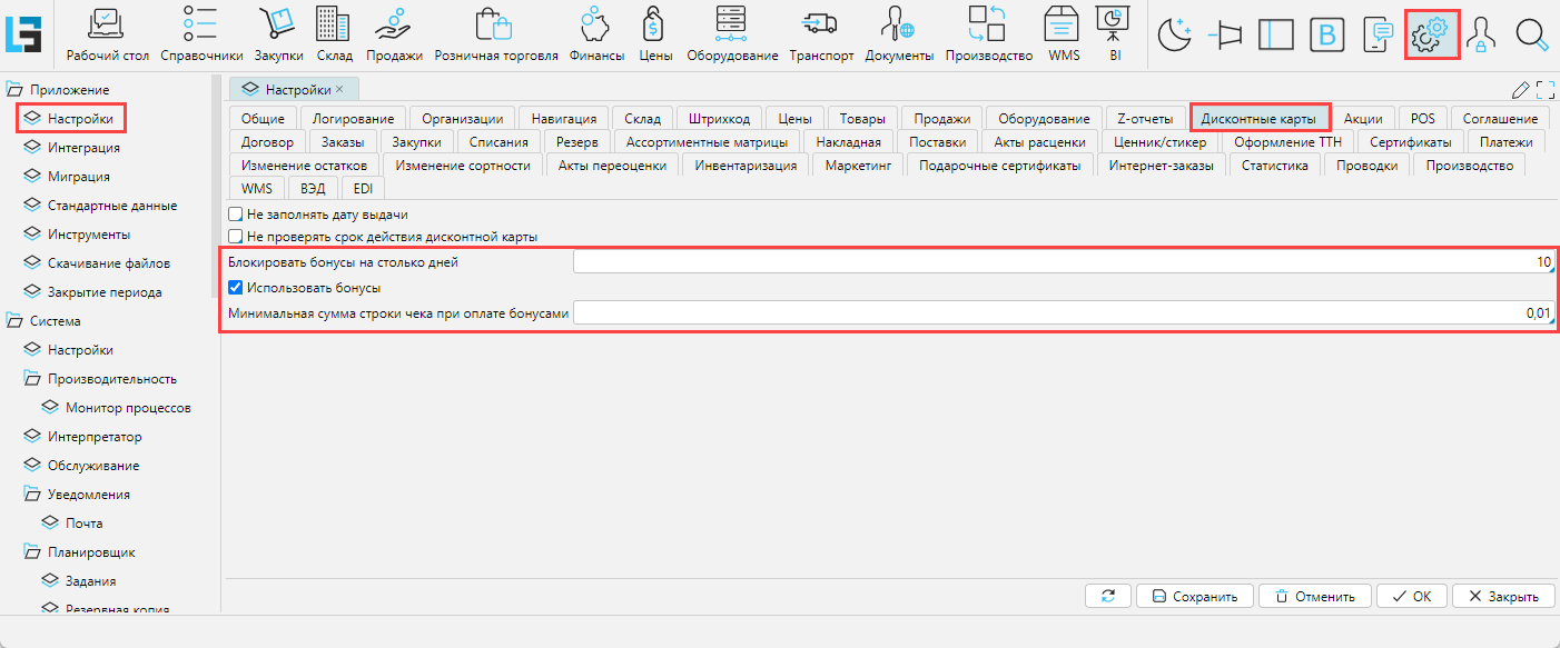Для активации бонусной программы в Администрирование - Настройки - Дисконтные карты необходимо: