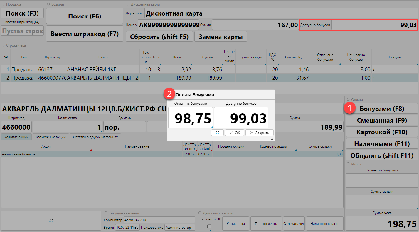 В POS кассир видит количество бонусов на дисконтной карте покупателя. Чтобы использовать бонусы для оплаты нужно: