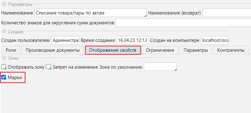 - В настройках операций, в которых необходимо прослеживание марок, на вкладке Отображение свойств отметить признак Марки, это позволить просматривать коды маркировки в документе.