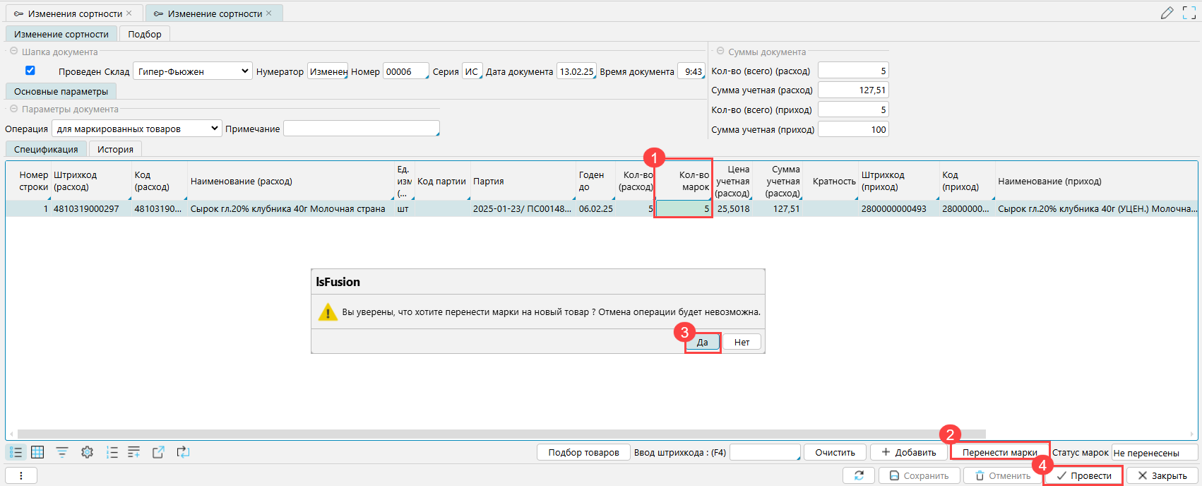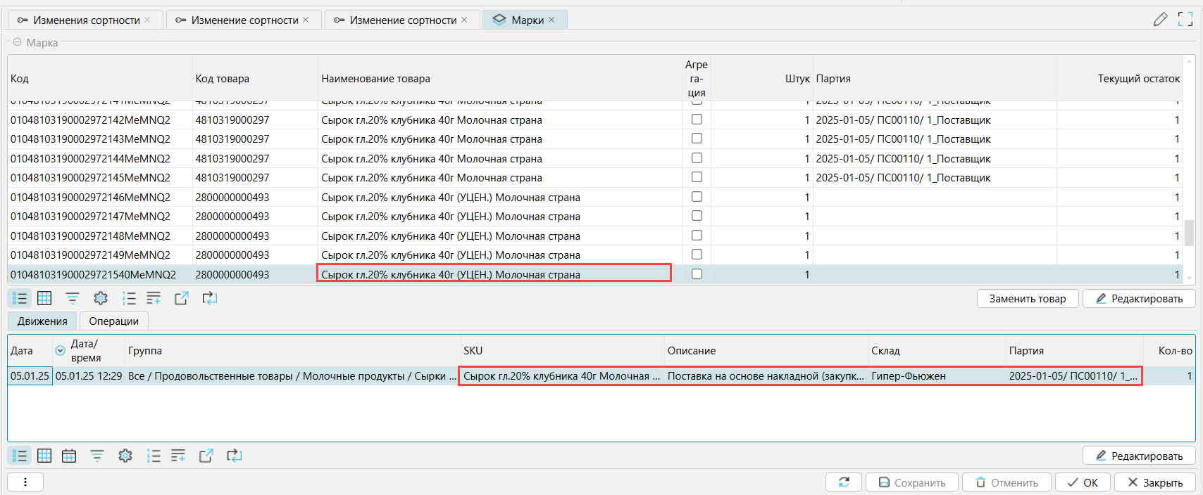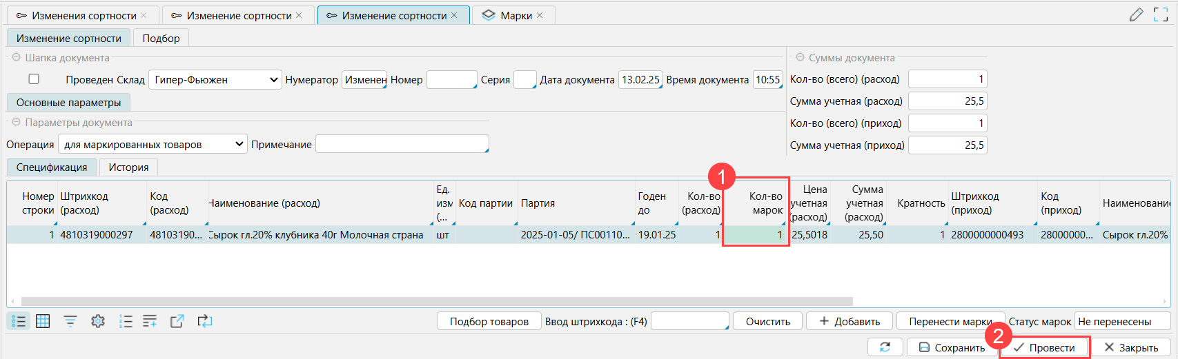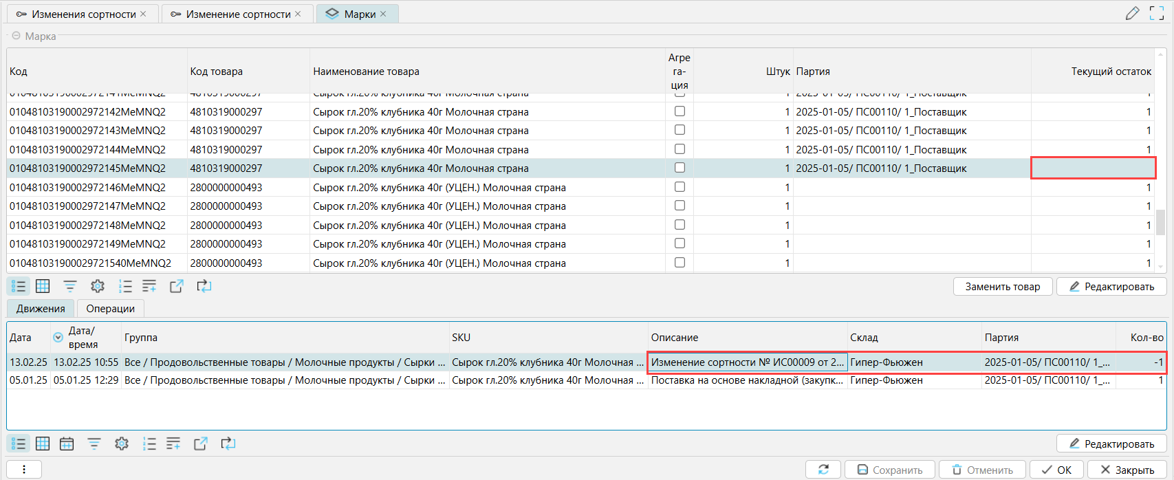 На форме Склад - Марки перенесенные марки будут числиться за товарами с измененной сортностью, но при этом в движении будет отображаться документ, по которому марка пришла в систему.