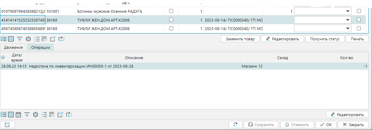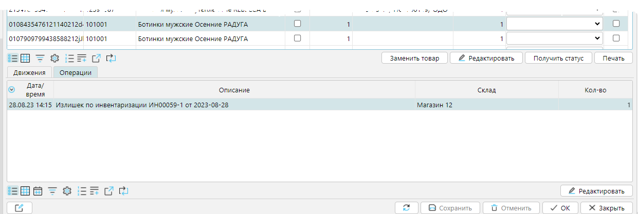4. После проведения инвентаризации остаток марок выравнивается в соответствии с документом. Постановка на учет/списание марки инвентаризацией отображается на форме Склад - Марки на вкладке Операции