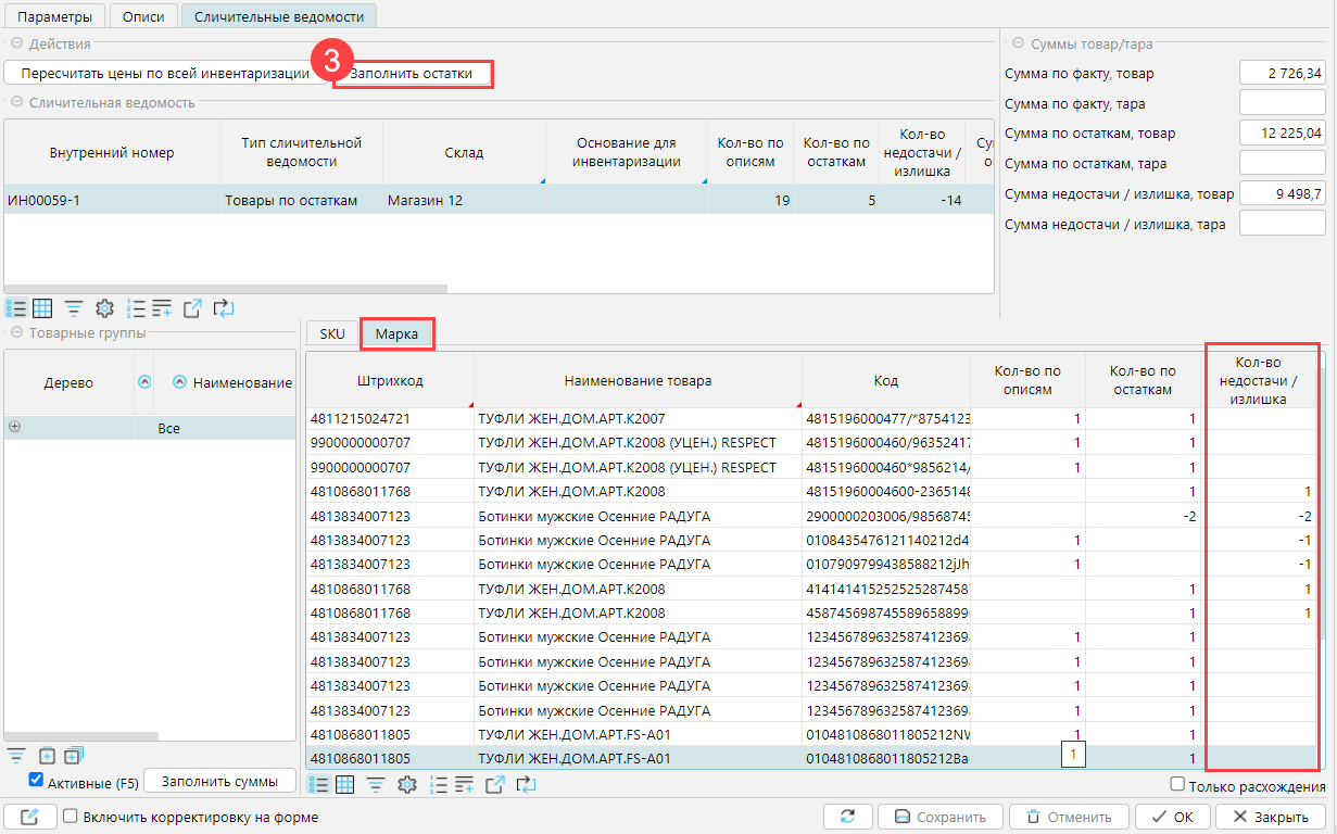 3. На вкладке Сличительные ведомости после нажатия кнопки Заполнить остатки система сравнит данные в описи с остатками в системе как по товарам, так и помаркам. На вкладке Марка можно просмотреть результат инвентаризации марок.