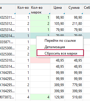 Есть возможность сбросить все марки в описи, для этого нужно стать на любую строку в колонке Кол-во марок, вызвать подменю правой клавишей мыши и выбрать там Сбросить все марки - марки сбросятся по всем строкам в описи.