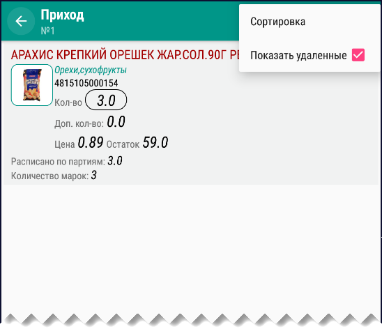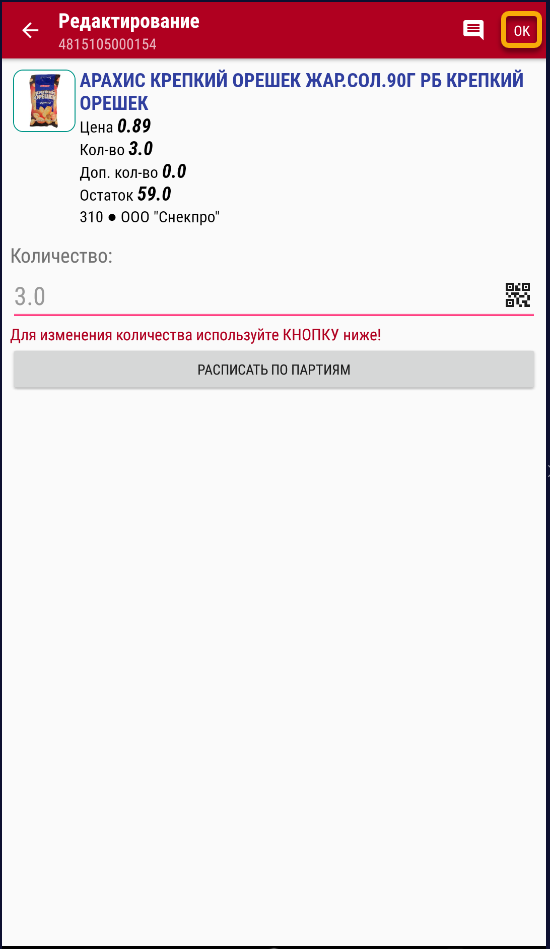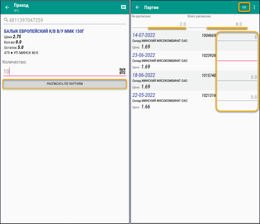 Чтобы была возможность указывать партии товаров необходимо для вида операции отметить флаг Партионный учет, а при загрузке БД загрузить партии товаров (см. п. Обмен данными). Товары, для которых есть данные по партиям, отмечены звездочкой. При добавлении таких товаров в документ доступна функция Расписать по партиям. Для товара отображаются все доступные партии и пользователь указывает какое количества товара на какую партию расписать. На экране также отображается итоговое расписанное и не расписанное количество.