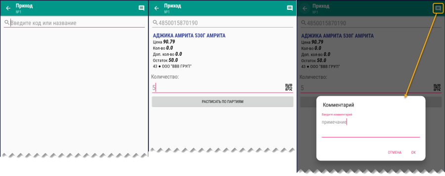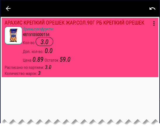 Для ввода товара в документ необходимо нажать кнопку . После чего попадаем на экран ввода товара. На данном экране товар можно выбрать, введя штрихкод (с клавиатуры или сканером) либо выбрать из списка нажав кнопку поиска .