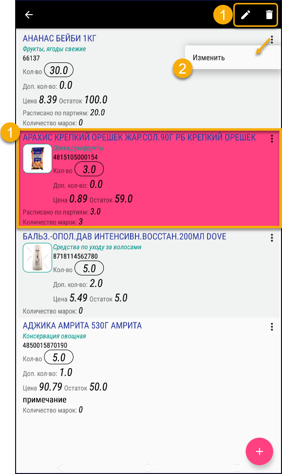 Для редактирования записи необходимо длинным нажатием выделить нужную строку и в появившемся меню нажать кнопку , либо открыть меню позиции и выбрать Изменить. Далее произвести редактирование значений полей и подтвердить кнопкой OK.