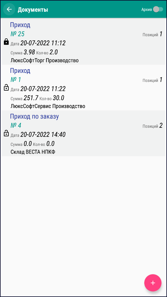 Данная форма отображает список активных и архивных документов. Документ попадает в архив после его выгрузки на ПК. Переключатель служит для переключения списка в режим просмотра архивных документов.