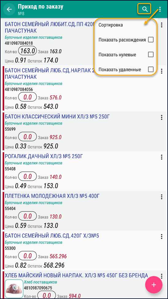 Поиск осуществляется по наименованию и штрихкоду товара по кнопке .