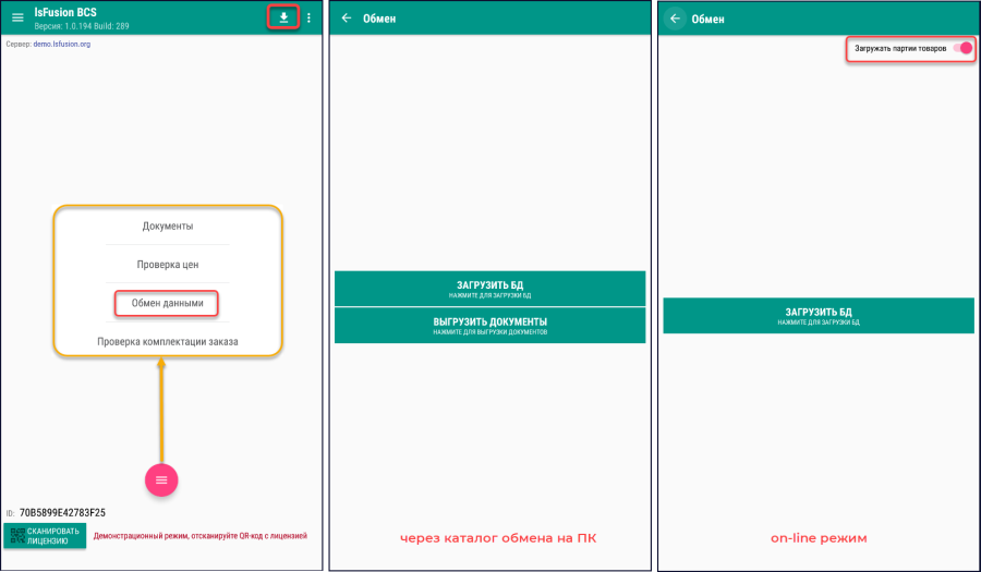 • ЗАГРУЗИТЬ БД - загрузка БД в терминал с сервера в on-line и файловом режиме (через каталог обмена на ПК).