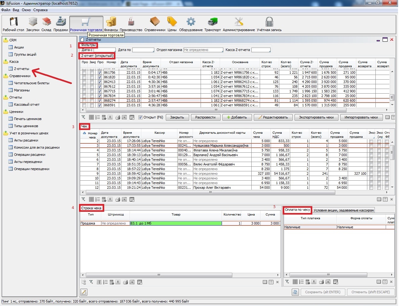 - об оплатах по чекам различных типов (наличные, банковская карточка)
