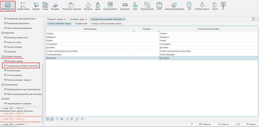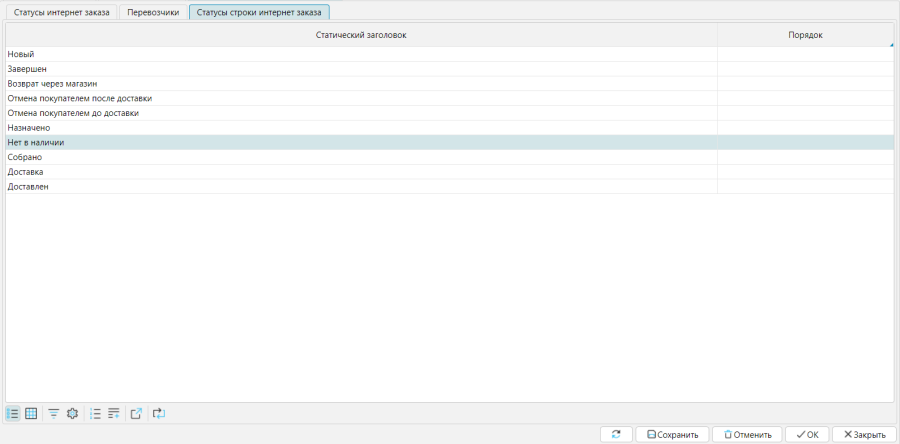 На форме Рабочий стол – Справочники интернет-магазина можно просмотреть статусы интернет-заказов и строк интернет-заказов. На каждом этапе работы с интернет-заказом изменяется статус его строк и на этом основании статус заказа. Статусы в основном изменяются автоматически, но при этом возможна ручная корректировка. Список статусов не может быть изменен пользователем, но и список статусов, и алгоритм их применения могут дорабатываться под нужды заказчика.