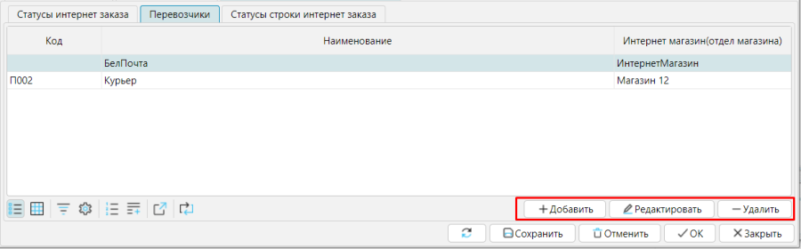 Еще один справочник интернет-магазина – это справочник перевозчиков, т.е. организаций, которые выполняют доставку заказов и принимают оплату. Перевозчиками могут выступать как собственные курьеры, так и специализированные организации. Список перевозчиков не ограничен, можно создавать необходимое количество перевозчиков и управлять списком с помощью кнопок Добавить, Редактировать, Удалить.