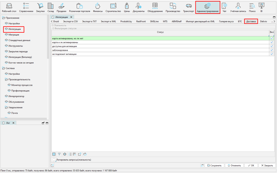 На форме Администрирование – Интеграция – Доставка надо отметить какие статусы относительно дисконтных карт значимы и будут использованы при обмене с платформой Delivio.