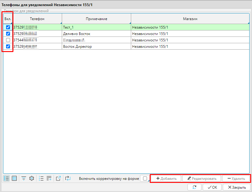 Для тех номеров, которые включены в рассылку, надо отметить признак Вкл.