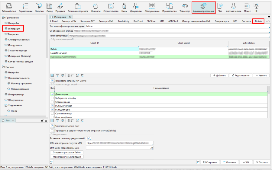 На форме Администрирование – Интеграция – Delivio можно отметить акции, которые будут действительны на платформе (Рис. 1.)