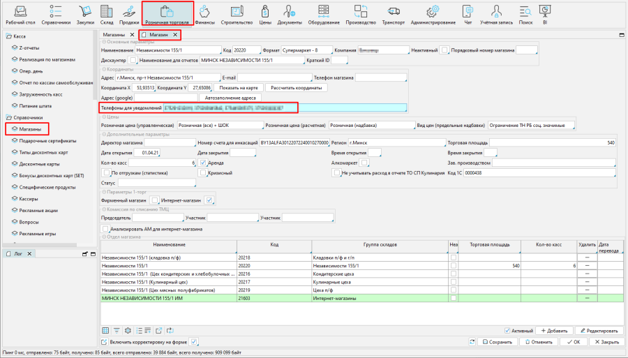 Для каждого магазина, где используют систему рассылки уведомлений, необходимо в поле Телефоны для уведомления задать номера телефонов, на которые будут поступать уведомления (Рис. 4).