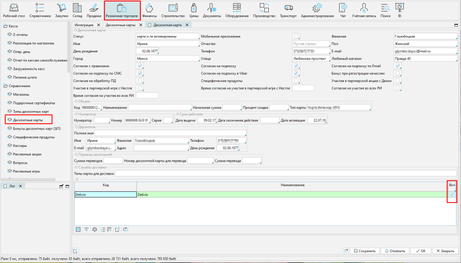 Если покупатель активирует свою карту на Delivio, эта информация будет передана интегратором и на форме дисконтной карты (Розничная торговля – Дисконтные карты, кнопка Редактировать) будет активировано соответствующее свойство, и программа лояльности по дисконтной карте будет применяться при заказах через платформу.
