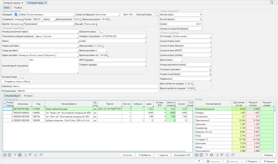 Заказы покупателей формируются на сайте платформы https://delivio.by и загружаются в систему lsFusion ERP. Все заказы отображаются на форме Рабочий стол – Интернет-магазин – Интернет-заказы.