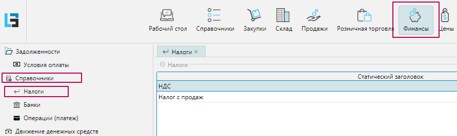 Модуль Финансы/ раздел Справочники/ форма Налоги