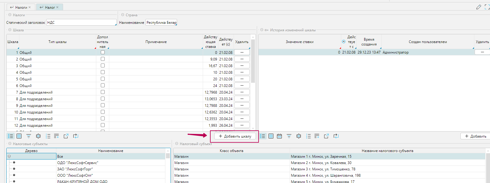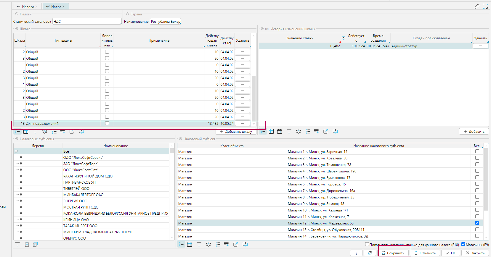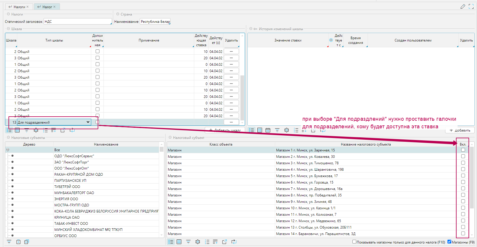 Тип шкалы налога Общий действует для всех подразделений, а тип  Для подразделений позволяет выбрать и отметить конкретные магазины и отделы магазинов.