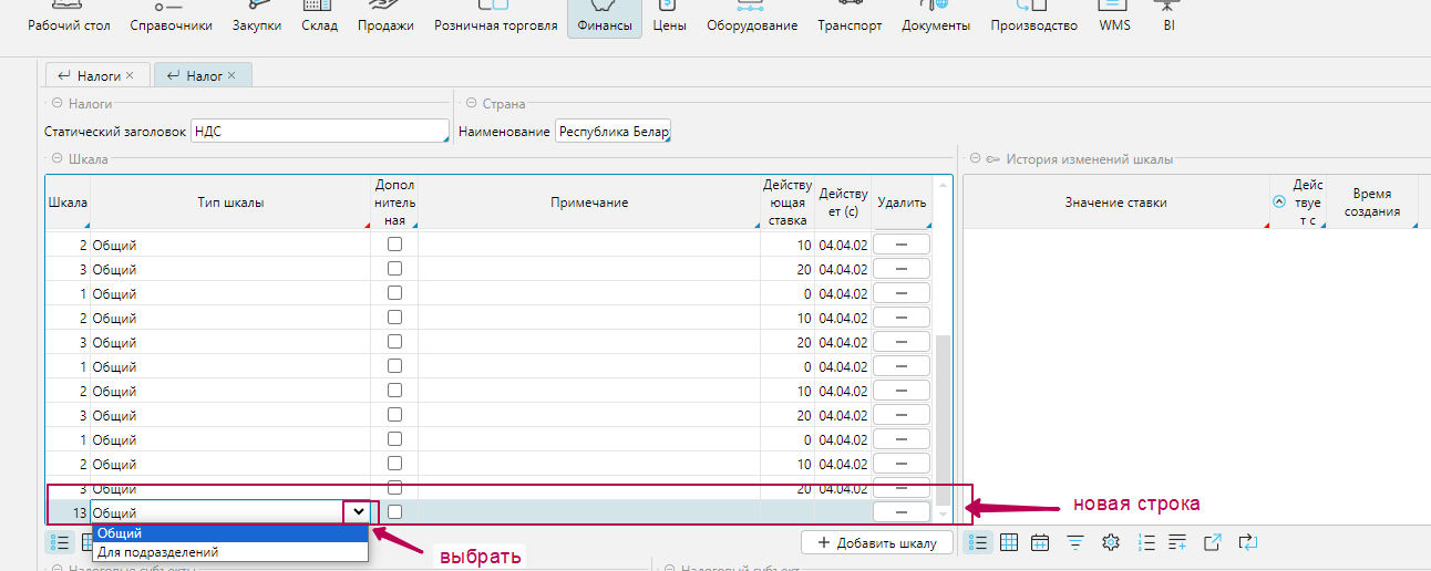 Стоя на строке новой шкалы, перейти в окно "История изменения шкалы". Нажать "Добавить", после чего появится новая строка, в ней заполнить: