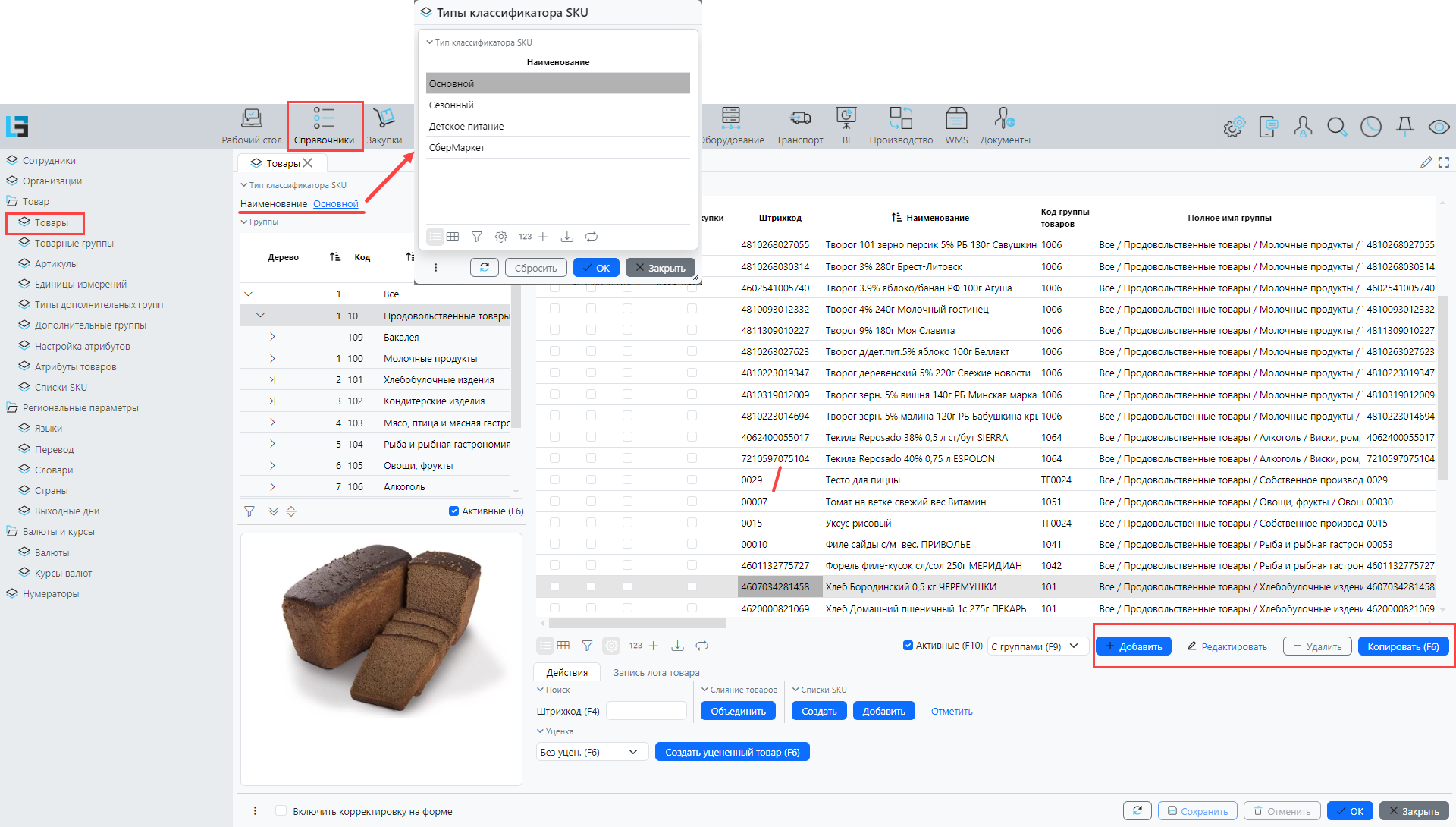 Списком товаров управляют с помощью кнопок Добавить, Редактировать, Удалить, Копировать.