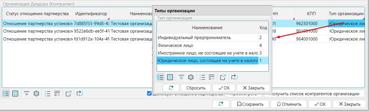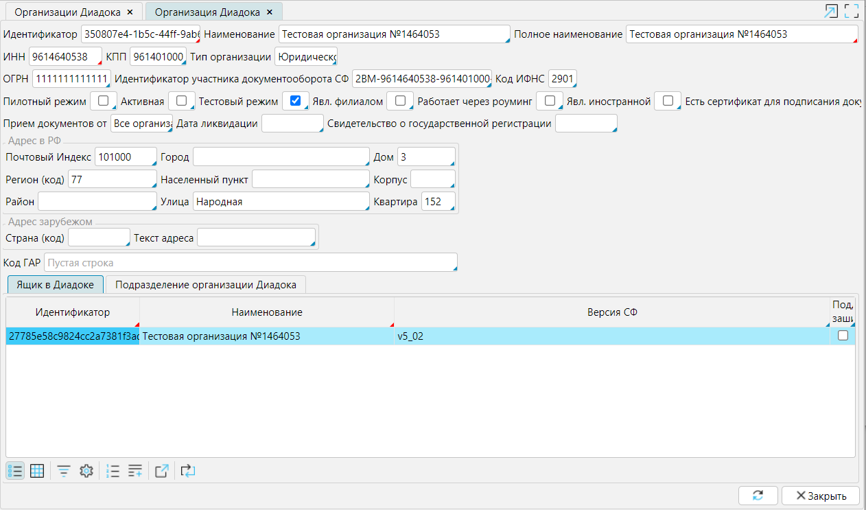 Единственное поле, которое можно редактировать из программы - Тип организации. По умолчанию в Диадоке все организации являются "Юридическим лицом, состоящим на учете в налоговых органах". Поле Тип организации можно изменить или в карточке организации, или в списке организаций.